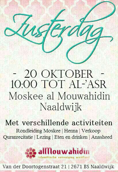 Zondag 20 oktober vanaf 10 uur zal er insa Allah een zusterdag plaats vinden. Tijdens deze dag zullen er allerlei activiteiten plaats vinden voor onze zusters. Voor meer informatie kun je de flyer raadplegen.