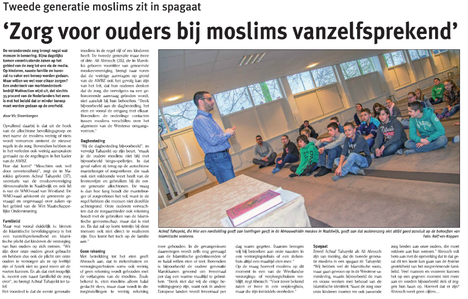 Onlangs verscheen er in het Hele Westland van 18 februari 2015 een artikel over de recente veranderingen in de zorg waarbij voor zorg steeds vaker een beroep dient te worden gedaan op naaste familie, kennissen of buren. In dit artikel komen twee van onze bestuursleden aan het woord: Achraf Tahayekt en Ali Ahrouch.