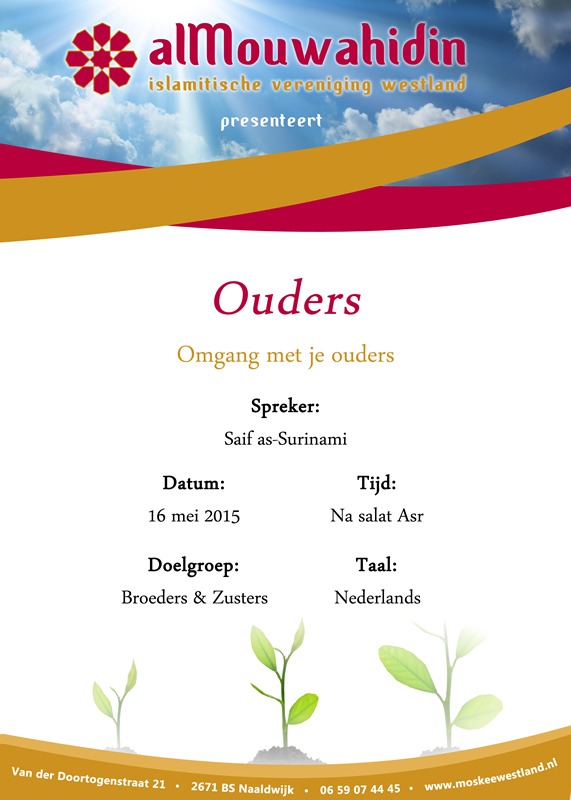 Zaterdag 16 mei 2015 wordt er insa Allah na salat al Asr een lezing gegeven met als onderwerp Ouders: omgang met je ouders. Bekijk hieronder de flyer voor meer informatie.