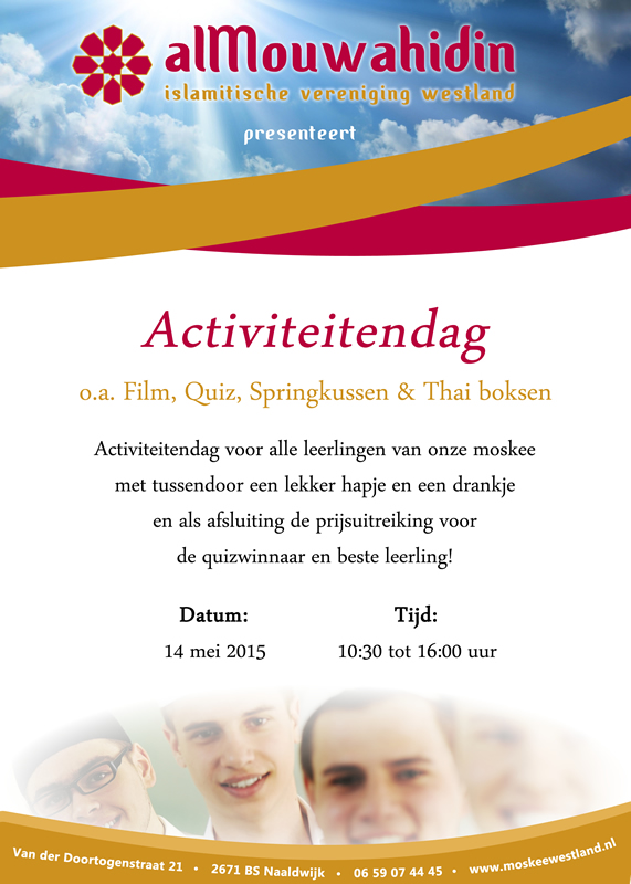 Donderdag 14 mei 2015 wordt er insa Allah een activiteitendag georganiseerd voor alle leerlingen van onze moskee. Bekijk hieronder de flyer voor meer informatie.