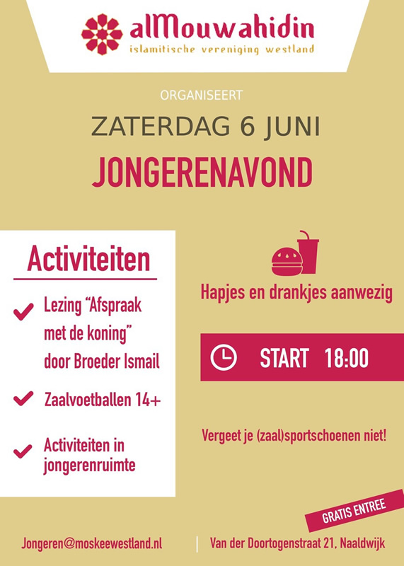 Zaterdag 6 juni 2015 wordt er insa Allah vanaf 18:00 uur een jongerenavond georganiseerd. Bekijk hieronder de flyer voor meer informatie.
